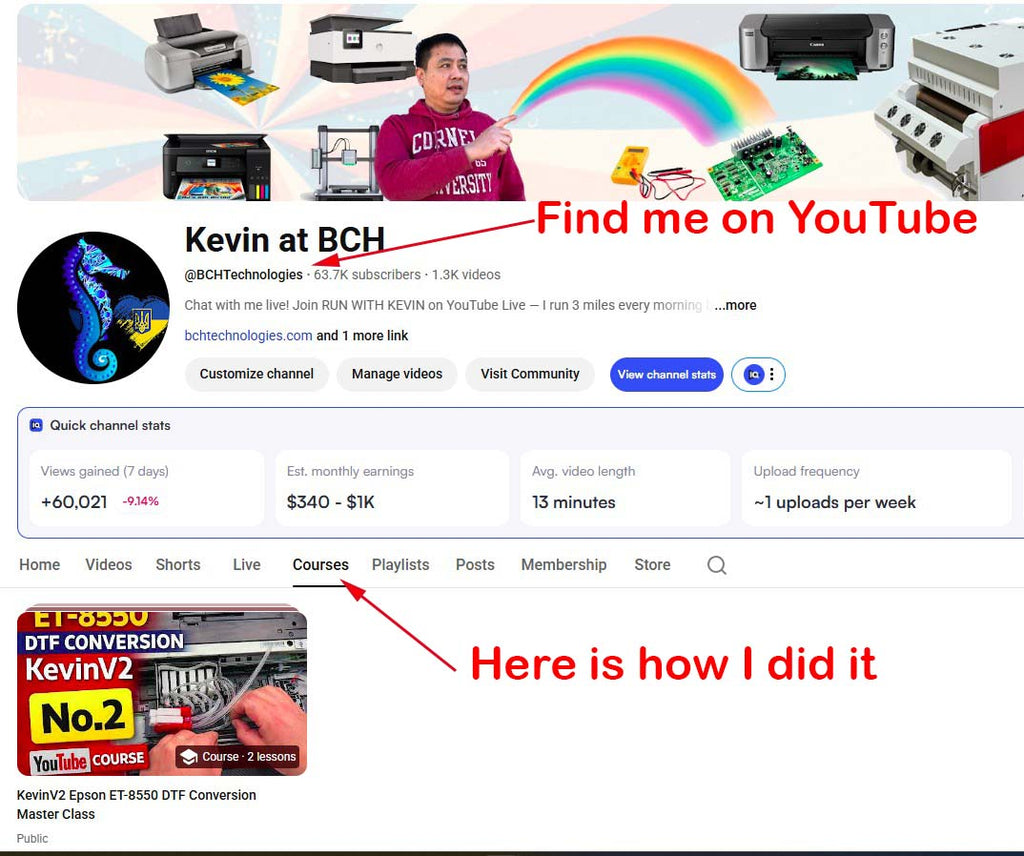 If you've searched "DTF Conversion ET-8550 Course" on YouTube, you've likely seen my channel where I teach full DTF conversions step-by-step. This printer is built using my 2026 Kevin V2 conversion platform - refined from years of real-world DTF experience.